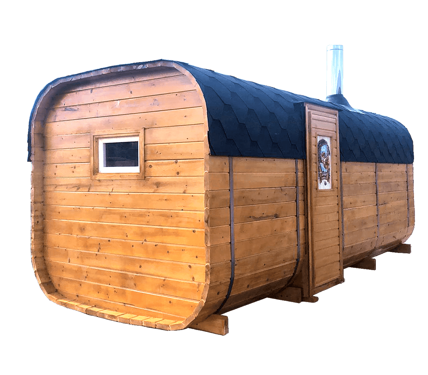 Круглая форма бани и печка избыточной мощности обеспечивает быстрое время нагрева. Причина в том, что нет углов, где тепло может попасть в ловушку. Это означает сокращение объема на 29% и более эффективное использование тепловой энергии.